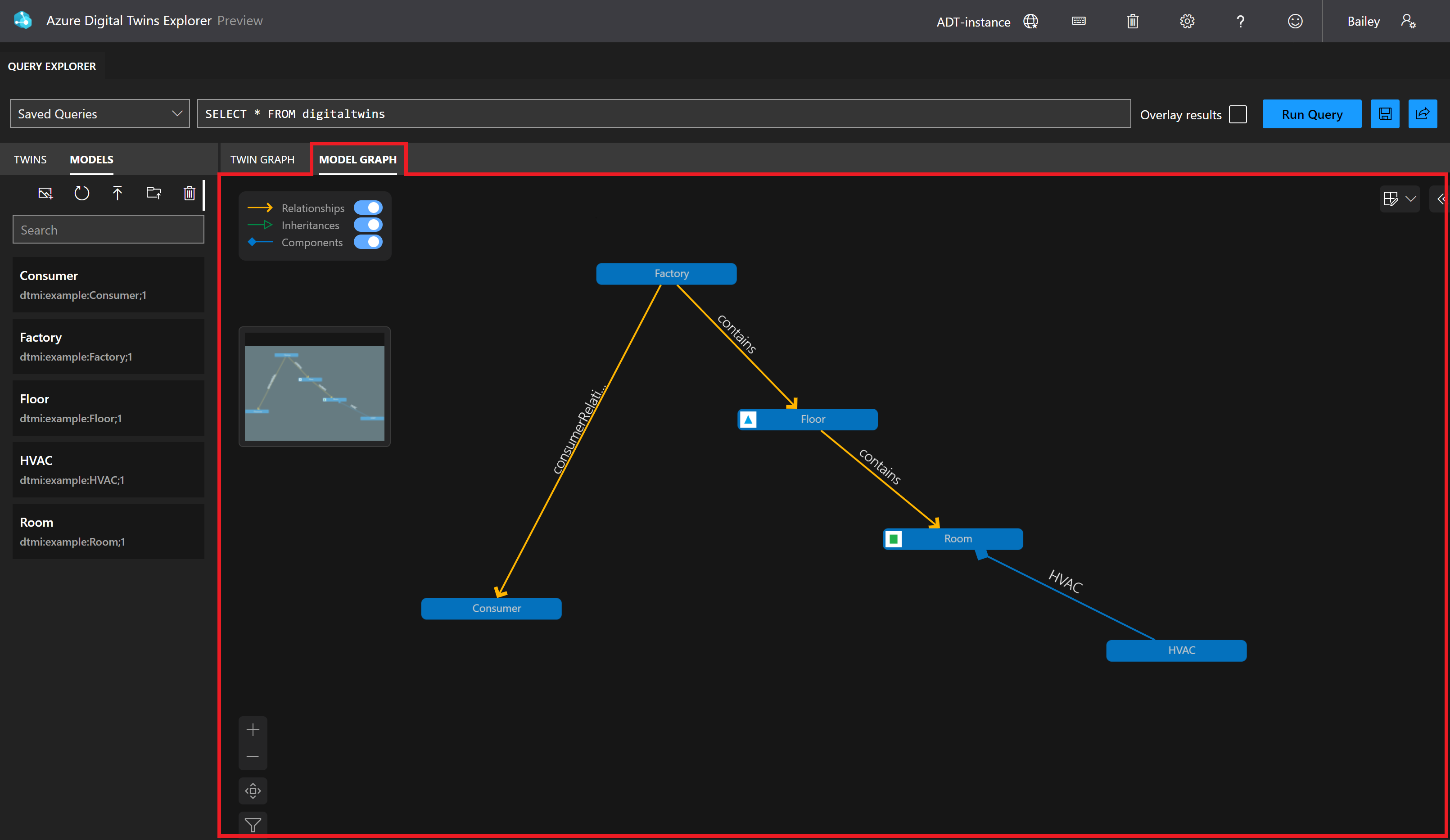 Once you have uploaded models into your Azure Digital Twins instance, you can use Azure Digital Twins Explorer to view them. The explorer contains a list of all models in the instance, as well as a model graph that illustrates how they relate to each other, including any inheritance and model relationships.