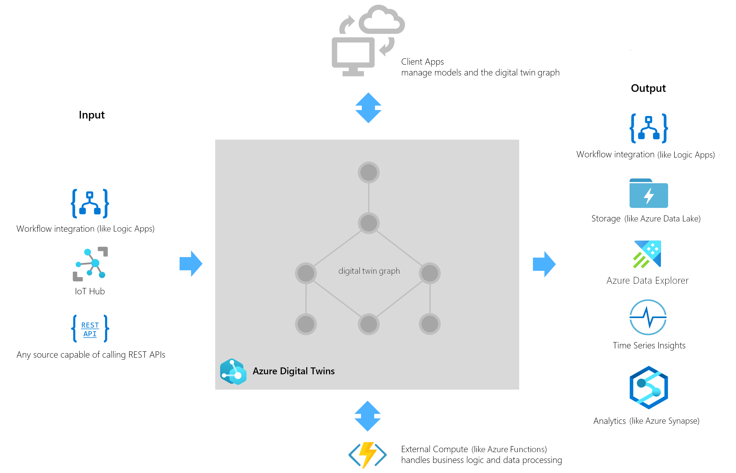 Azure Digital Twins provides a rich event system to keep your graph current, including data processing that can be customized to match your business logic. You can connect external compute resources, such as Azure Functions, to drive this data processing in flexible, customized ways.
