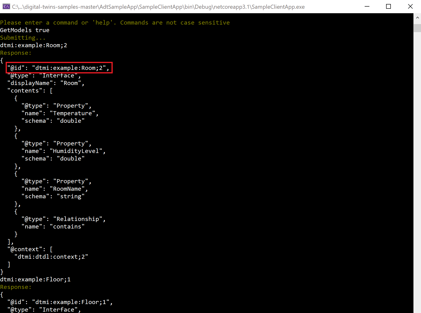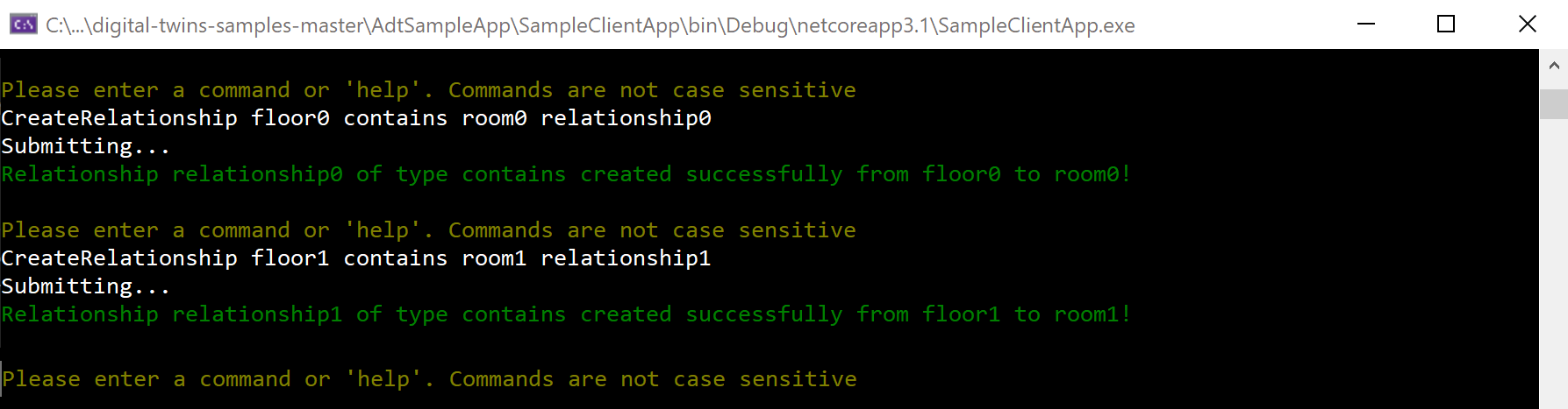 Return to your console window that's open to the digital-twins-samples-main\AdtSampleApp\SampleClientApp folder, and run the console app again with