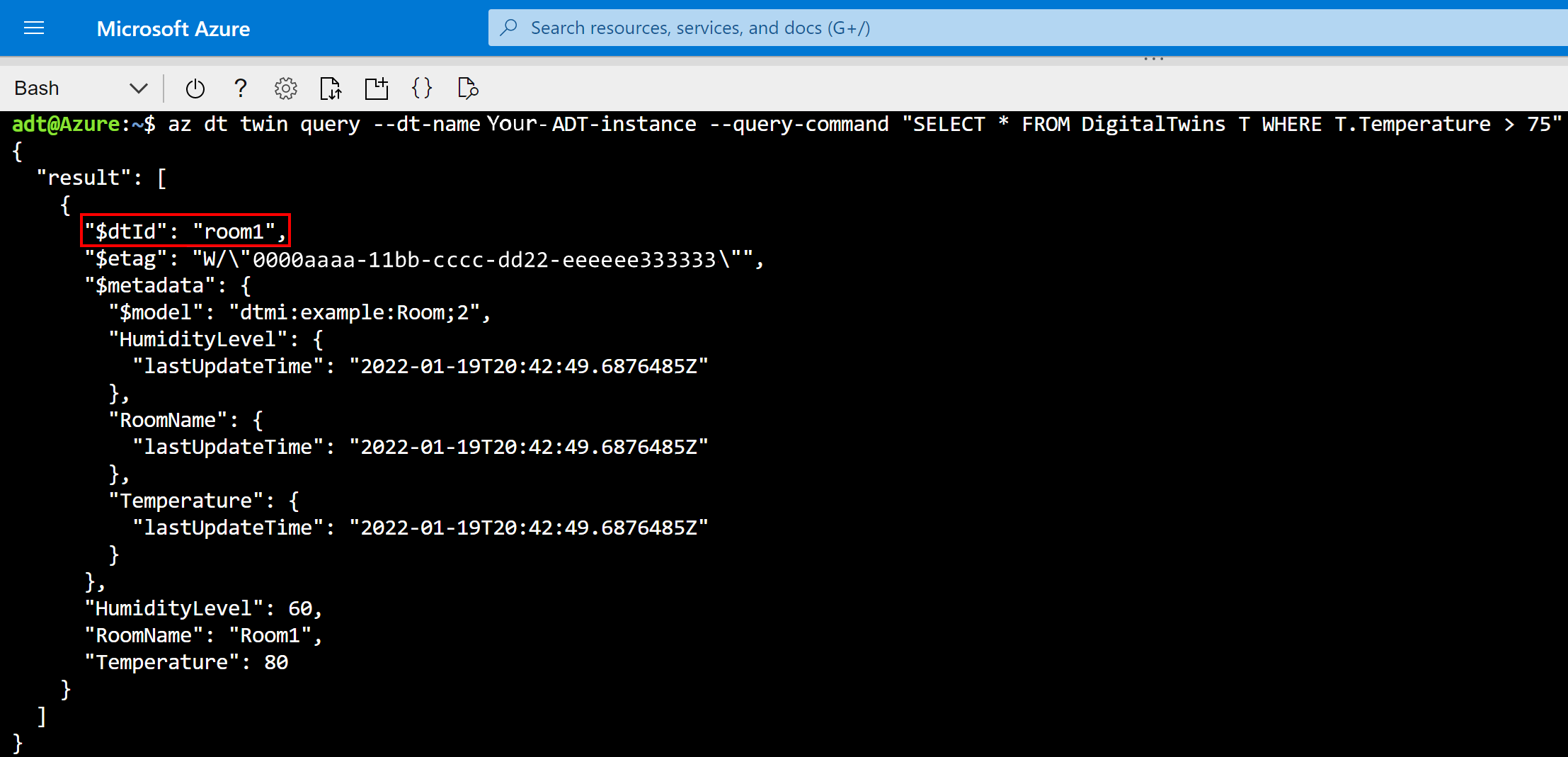 az dt twin query --dt-name <Azure-Digital-Twins-instance-hostname-or-name> --query-command "SELECT * FROM DigitalTwins T WHERE T.Temperature > 75"You can query the graph based on properties to answer different kinds of questions, including finding outliers in your environment that might need attention. Other comparison operators (<,>, =, or !=) are also supported. room1 shows up in the results here, because it has a temperature of 80.