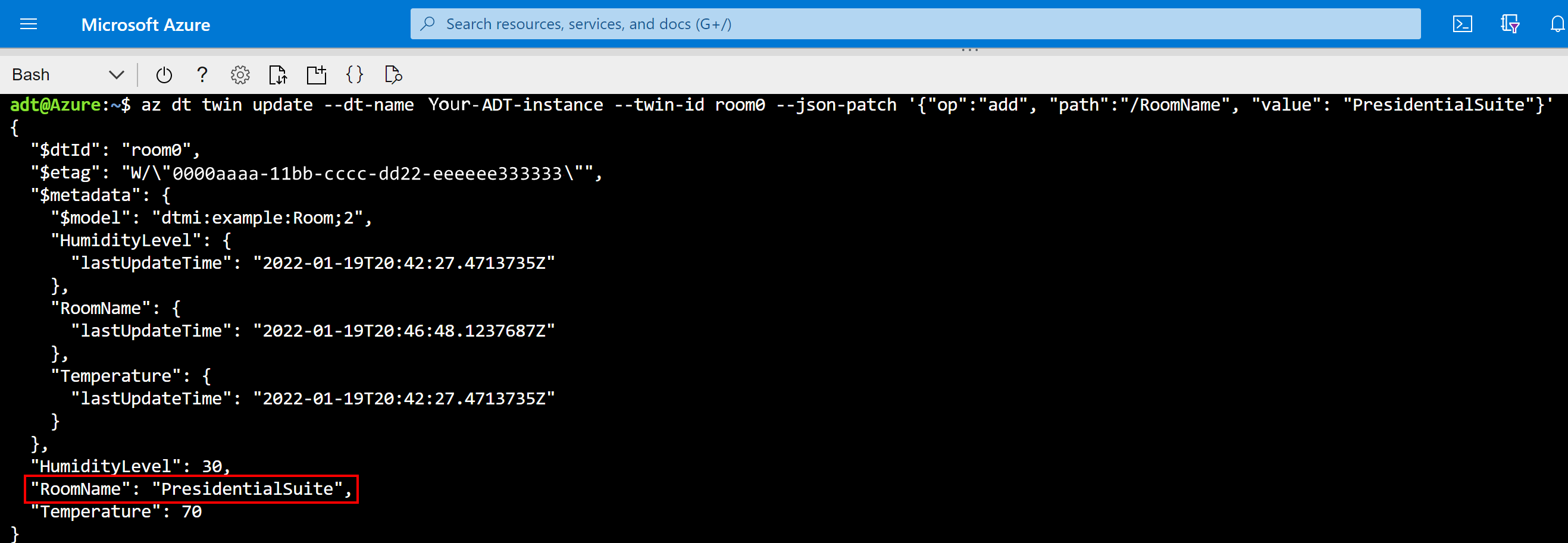 az dt twin update --dt-name <Azure-Digital-Twins-instance-hostname-or-name> --twin-id room0 --json-patch '{"op":"add", "path":"/RoomName", "value": "PresidentialSuite"}'Note