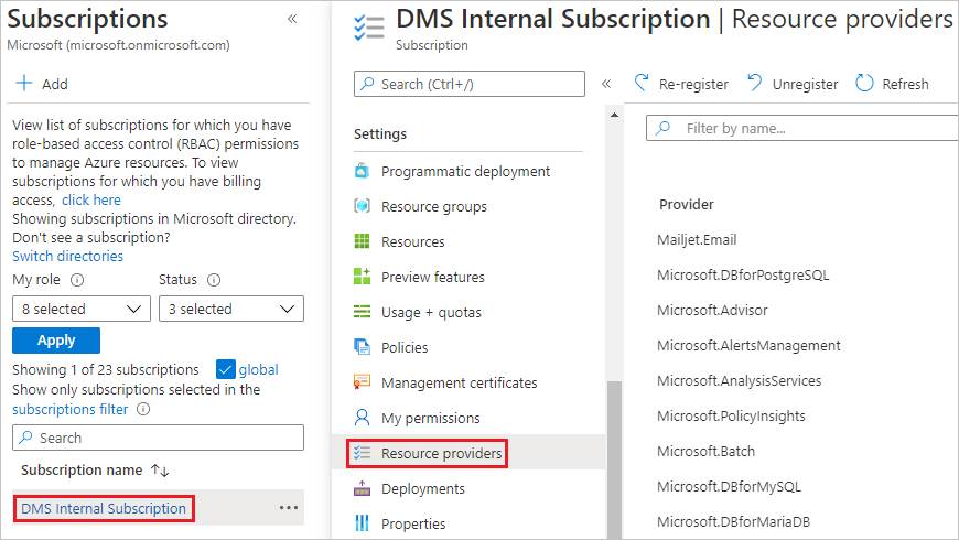 Register the Microsoft.DataMigration resource provider before you create your first instance of the Database Migration Service.