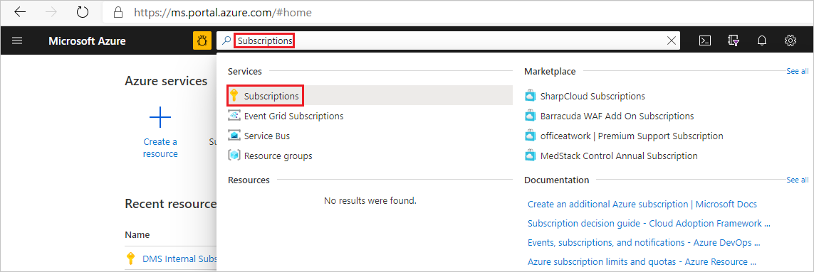 Sign in to the Azure portal. Search for and select Subscriptions.