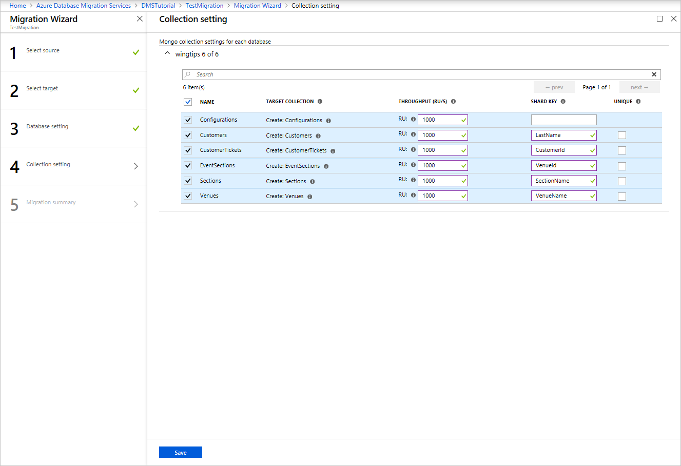 On the Collection setting screen, expand the collections listing, and then review the list of collections that will be migrated.