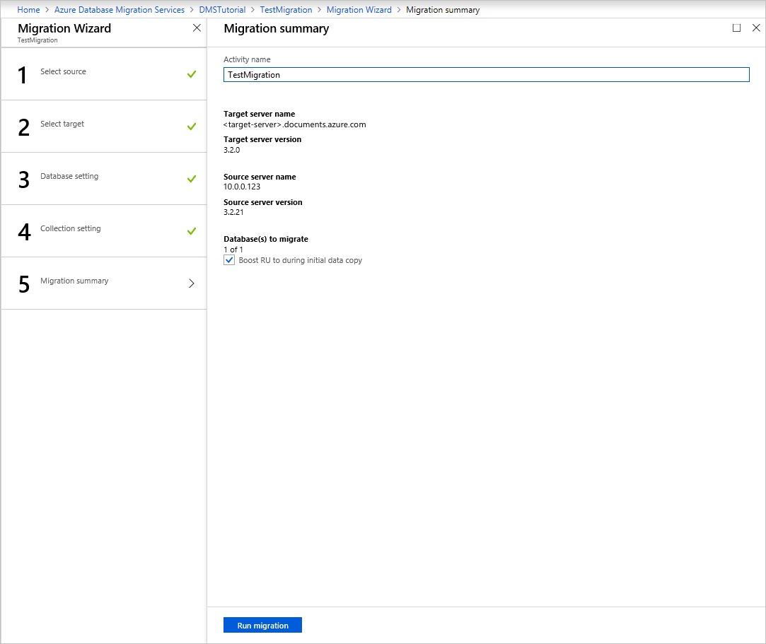 On the Migration summary screen, in the Activity name text box, specify a name for the migration activity.