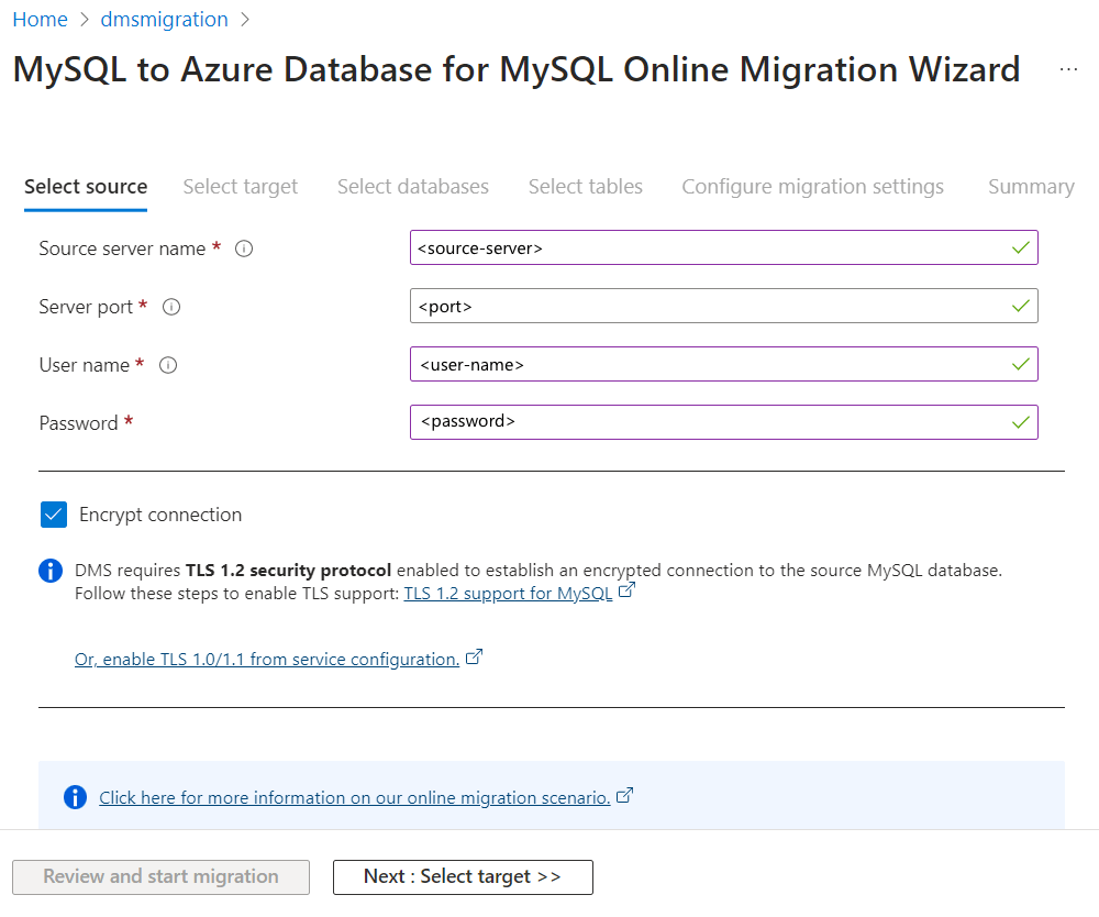 With your target flexible server deployed and configured, you next need to set up DMS to migrate your source MySQL server to a flexible server.