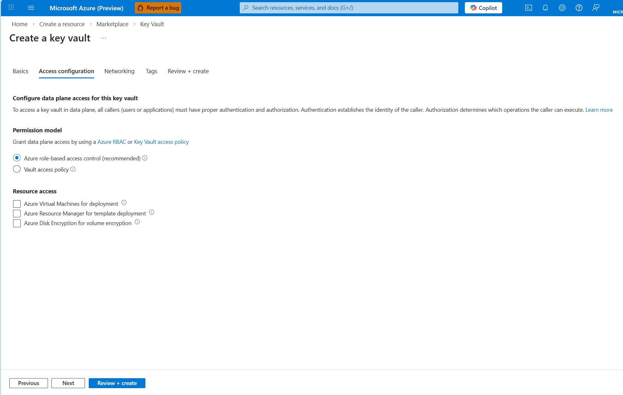 3. Select Review + create to create the key vault.