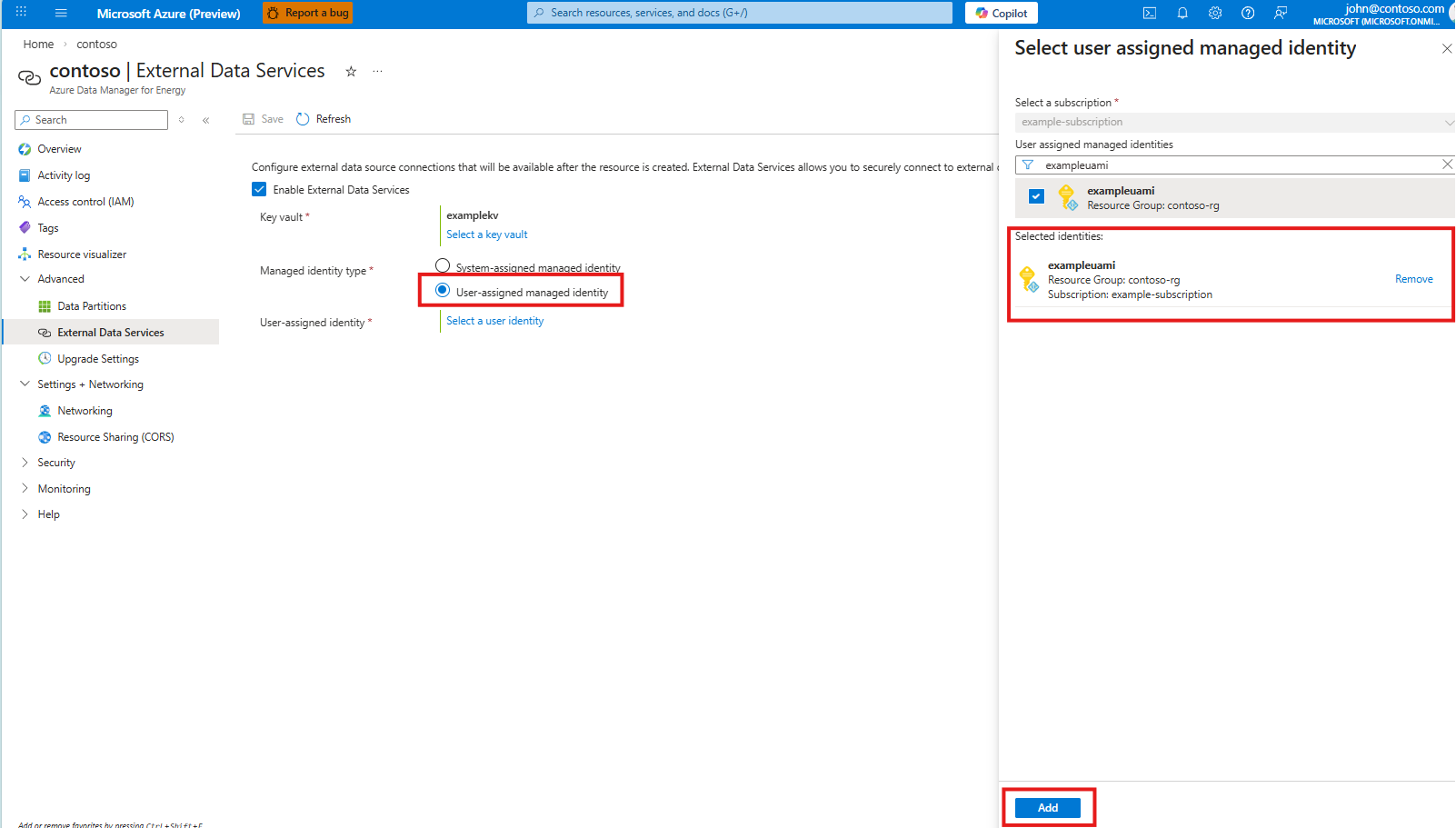 6. If you select User-assigned managed identity, select Select user assigned managed identity to open the form. Select the subscription and managed identity, and then select Add. Screenshot of selecting a user-assigned managed identity for External Data Services.