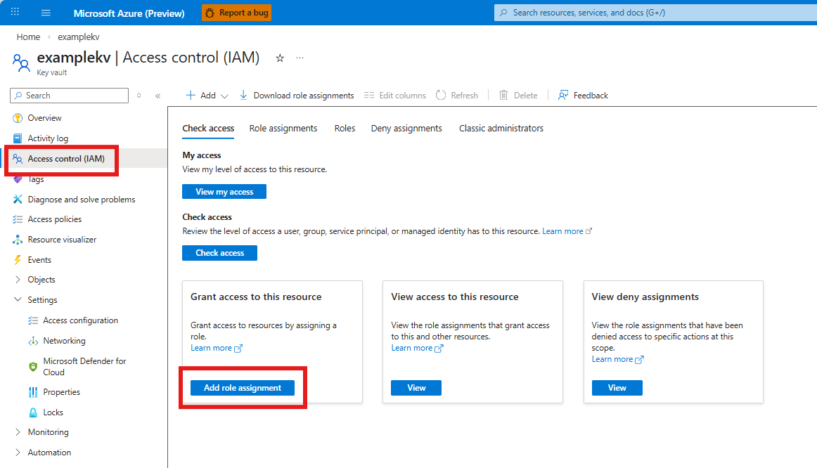 2. Select Access control (IAM) from the left menu and select + Add > Add role assignment. Screenshot of adding role assignment to key vault.