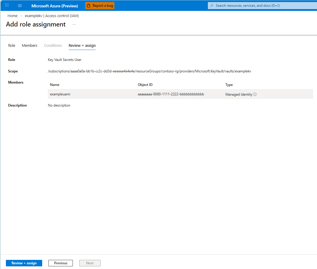 8. Select Review + assign to complete the role assignment.