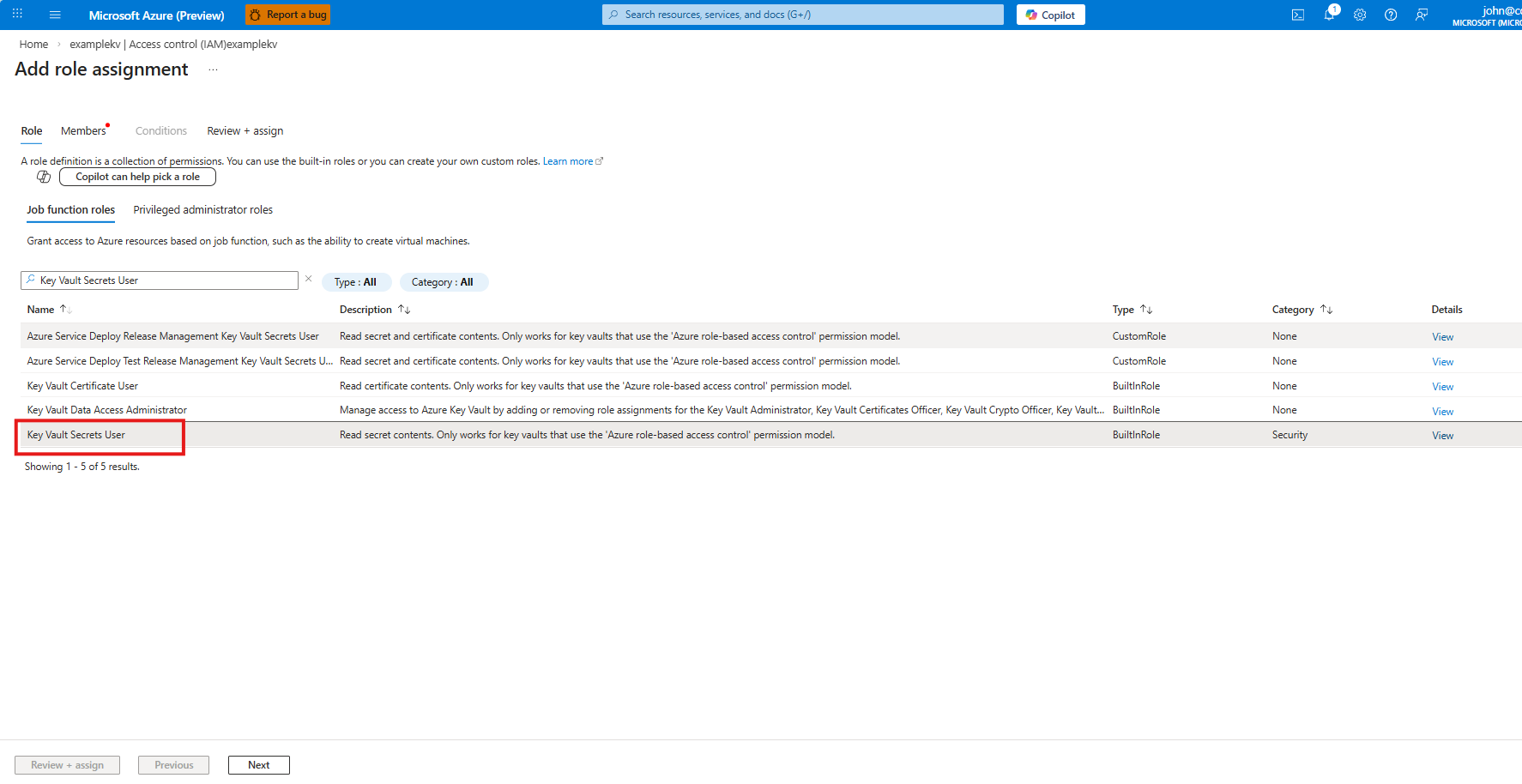 4. On the Role tab, select Job function roles, search for and select Key Vault Secrets User, and then select Next.