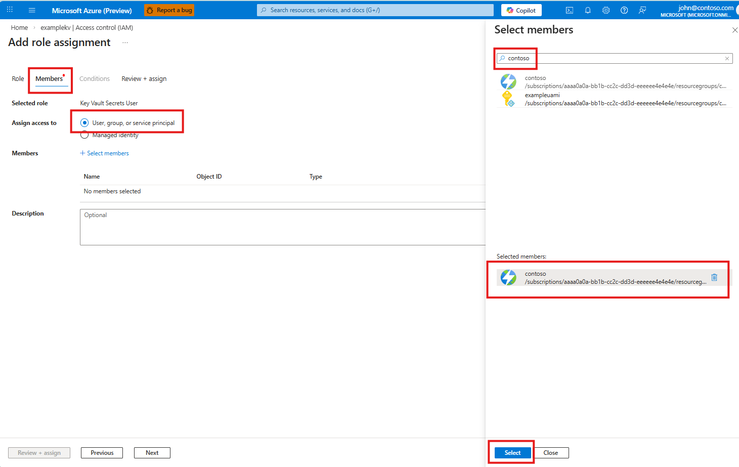 5. On the Members tab, select User, group, or service principal for Assign access to.