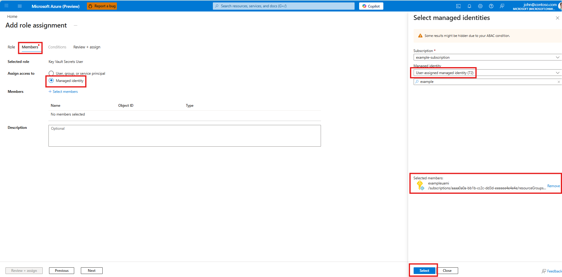 7. Select the user-assigned managed identity, and select Select. Screenshot of selecting a user-assigned managed identity.