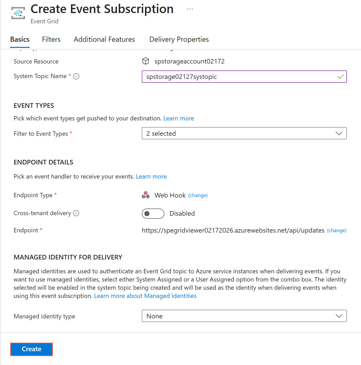 api/updatesto the home page URL (for example:https://spegridsite.azurewebsites.net/api/updates), and then select Confirm Selection.Now, on the Create Event Subscription page, select Create to create the event subscription.