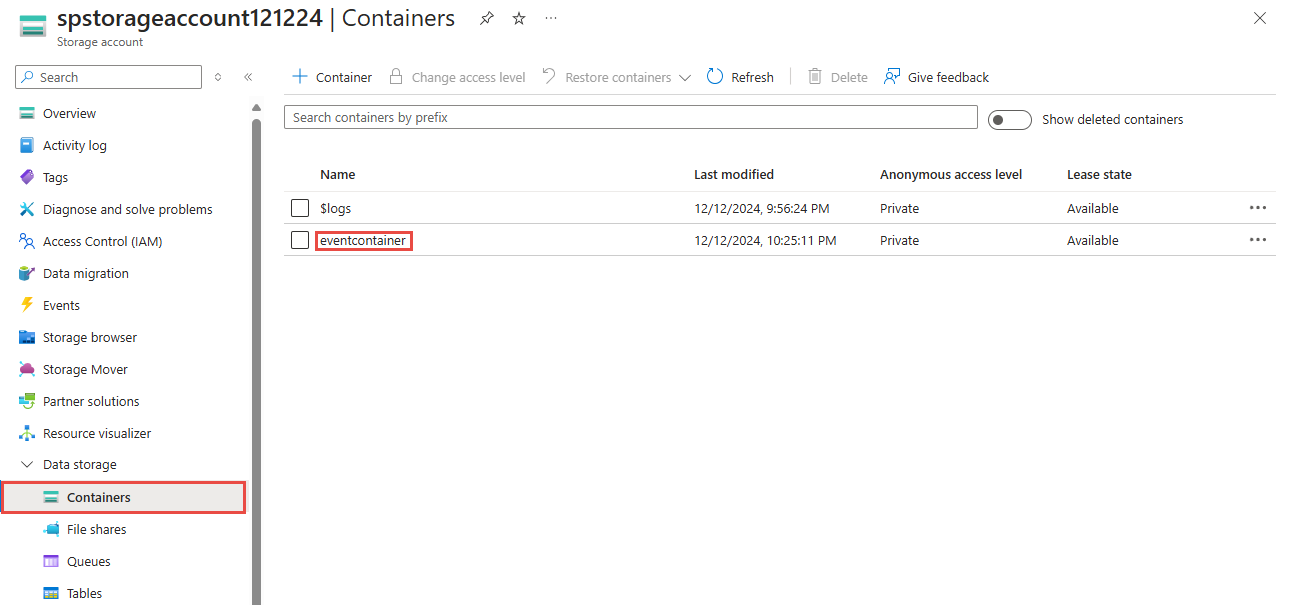 In the Azure portal, go to your Blob storage account, and select Containers on the left menu.
