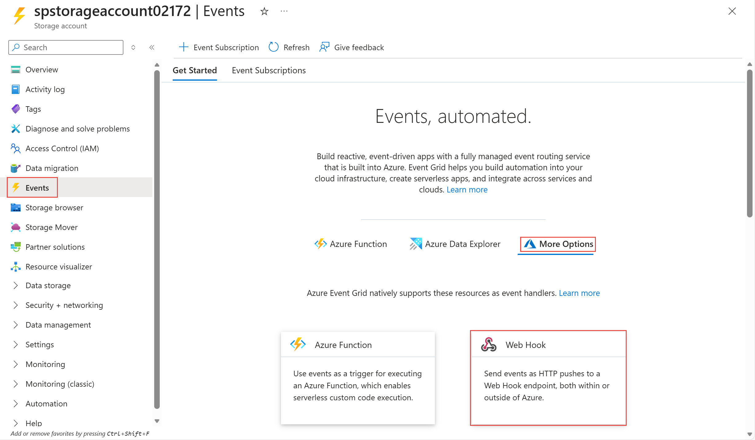 Select More Options, and Web Hook. You're sending events to your viewer app by using a web hook for the endpoint.