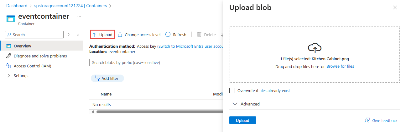 To upload a file, select Upload. On the Upload blob page, browse and select a file that you want to upload for testing, and then select Upload.
