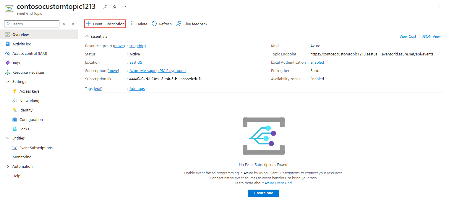 On the Event Grid Topic page for your custom topic, select + Event Subscription on the toolbar.