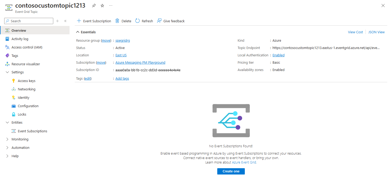 Provide a unique name for the custom topic. The topic name must be unique because it's represented by a DNS entry. Don't use the name shown in the image. Instead, create your own name - it must be between 3-50 characters and contain only values a-z, A-Z, 0-9, and