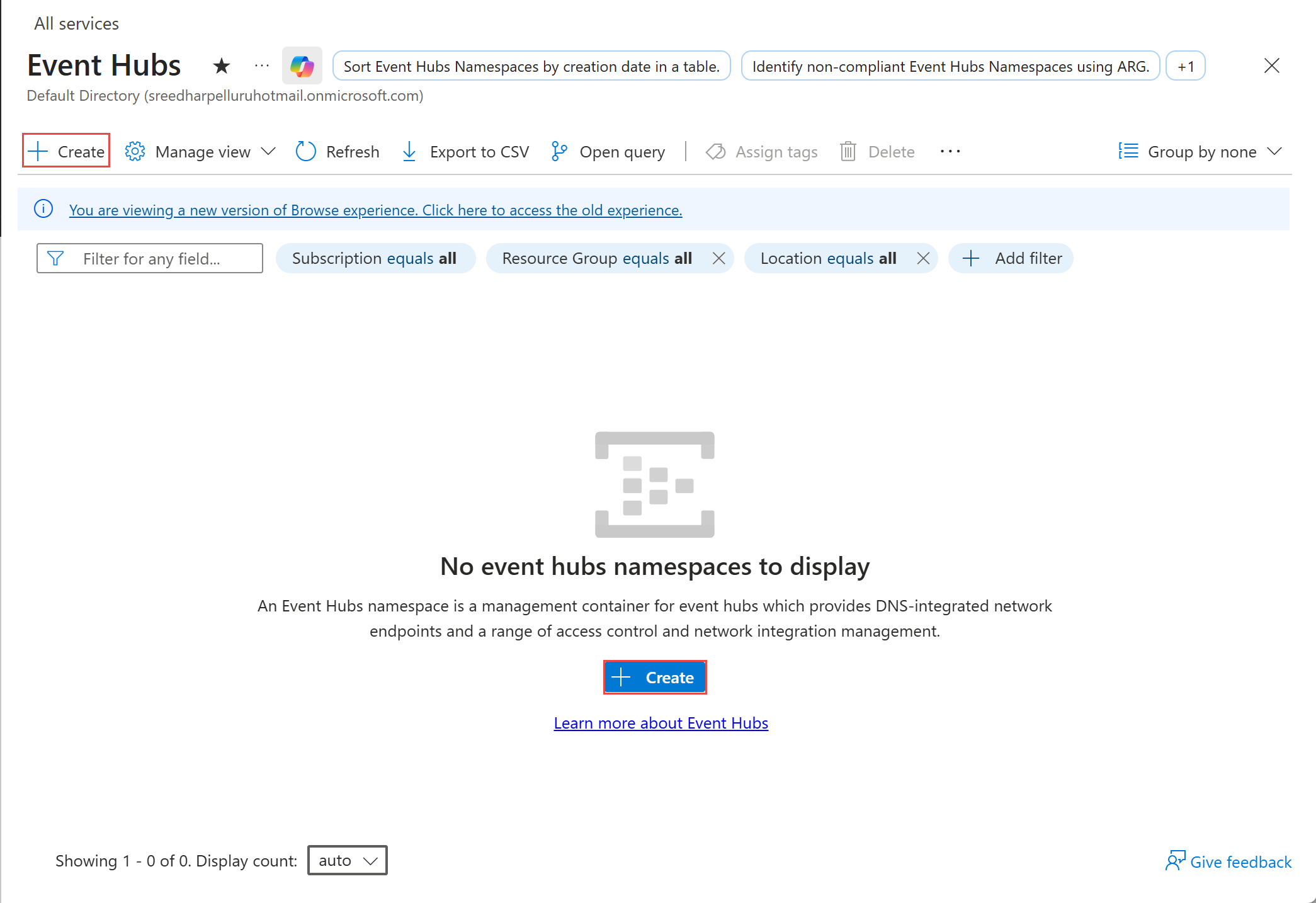 An Event Hubs namespace provides a unique scoping container, in which you create one or more event hubs. To create a namespace in your resource group using the portal, do the following actions: