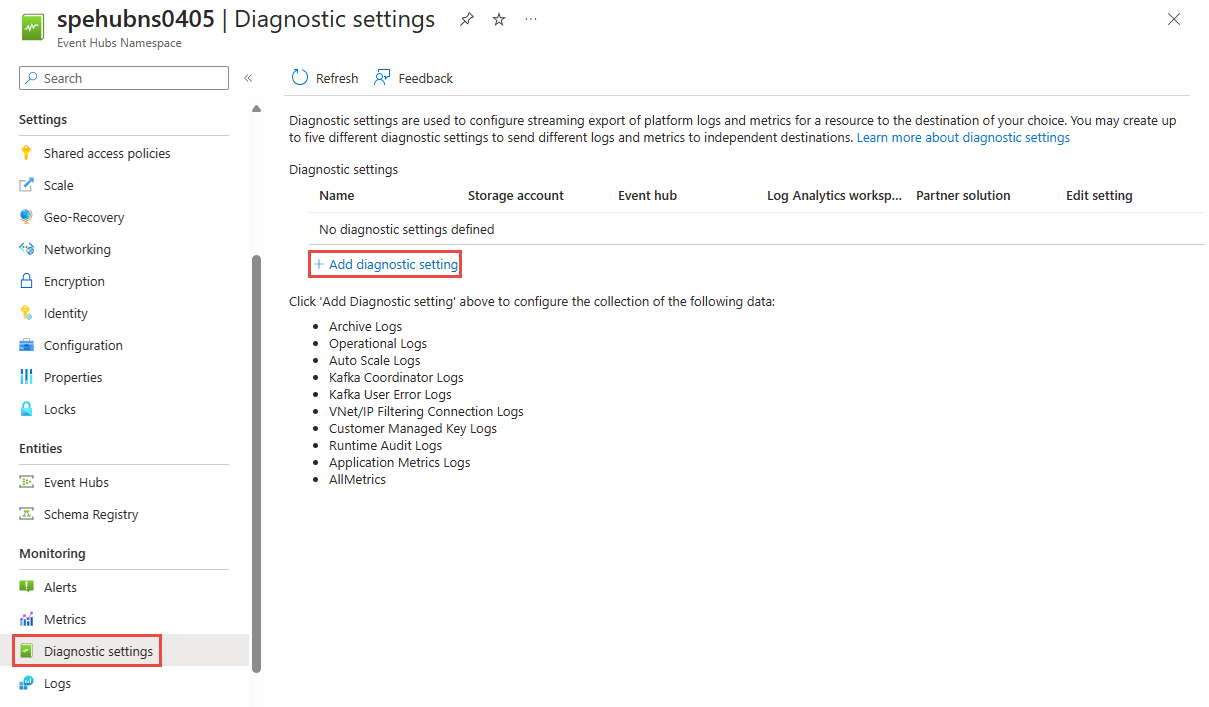 Resource Logs aren't collected and stored until you create a diagnostic setting and route them to one or more locations. When you create a diagnostic setting, you specify which categories of logs to collect. The categories for Azure Event Hubs are listed in Azure Event Hubs monitoring data reference.