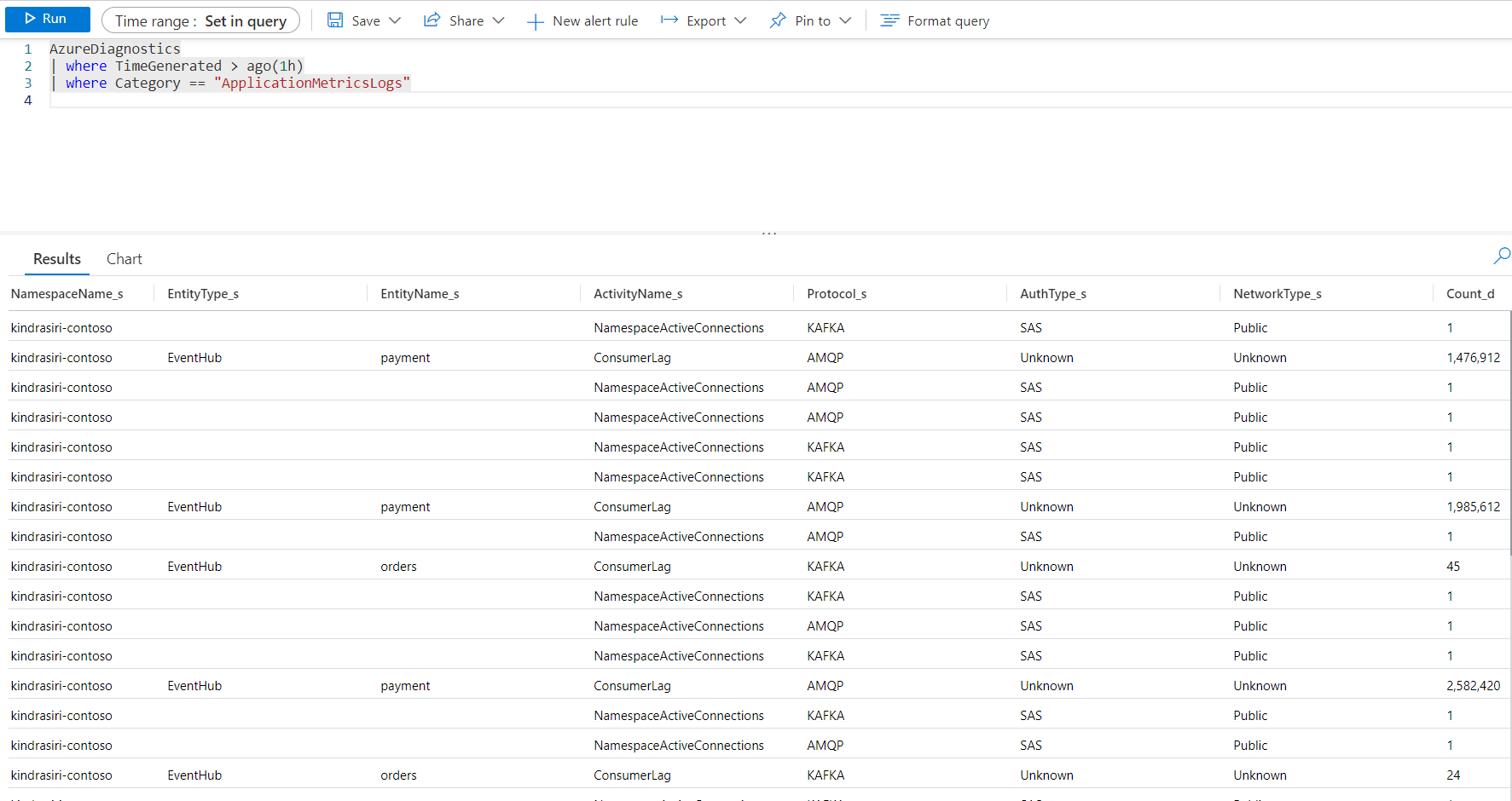 AzureDiagnostics | where TimeGenerated > ago(7d) | where ResourceProvider =="MICROSOFT.EVENTHUB" | where Category == "OperationalLogs" | summarize count() by "EventName"Get runtime audit logs generated in the last one hour.
