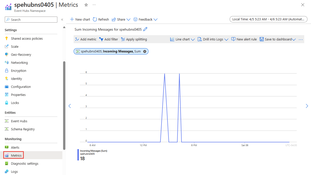 You can analyze metrics for Azure Event Hubs, along with metrics from other Azure services, by selecting Metrics from the Azure Monitor section on the home page for your Event Hubs namespace. See Analyze metrics with Azure Monitor metrics explorer for details on using this tool. For a list of the platform metrics collected, see Monitoring Azure Event Hubs data reference metrics.