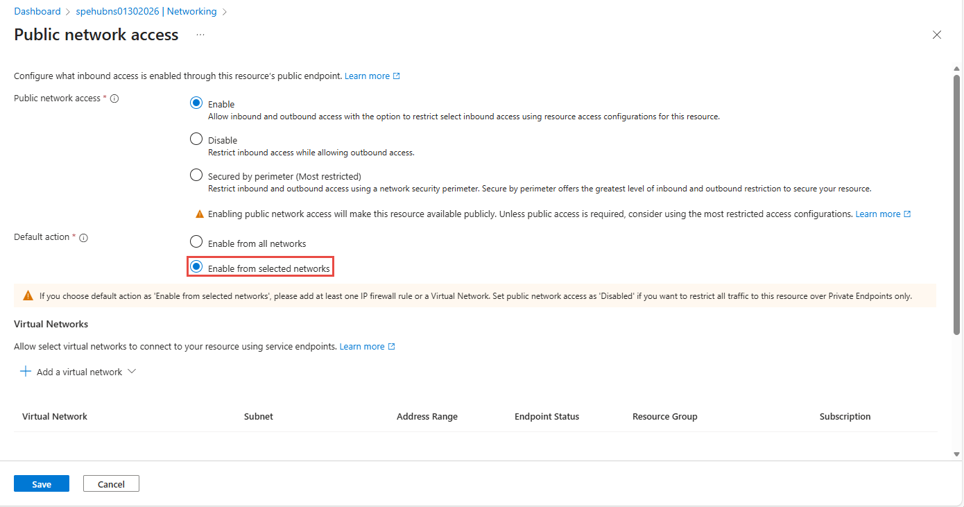 When creating a namespace, you can either allow public only (from all networks) or private only (only via private endpoints) access to the namespace.