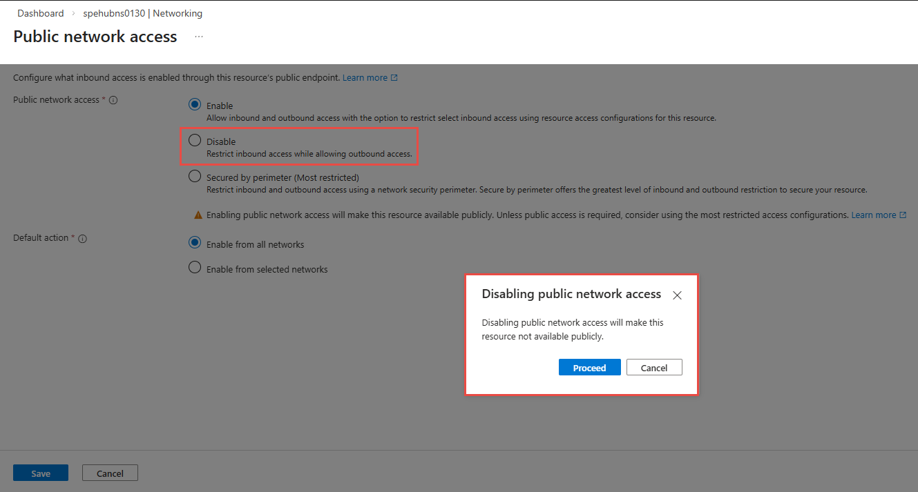 On the Public network access page, select Disable to restrict inbound access while allowing outbound access. In the pop-up, select Proceed to confirm.