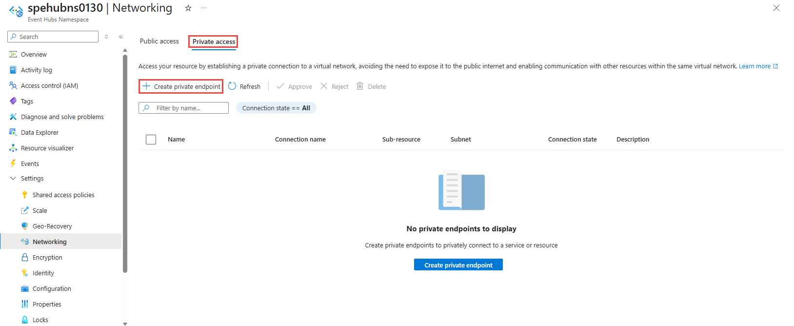 Now, add a private endpoint to your Event Hubs namespace by following these steps: