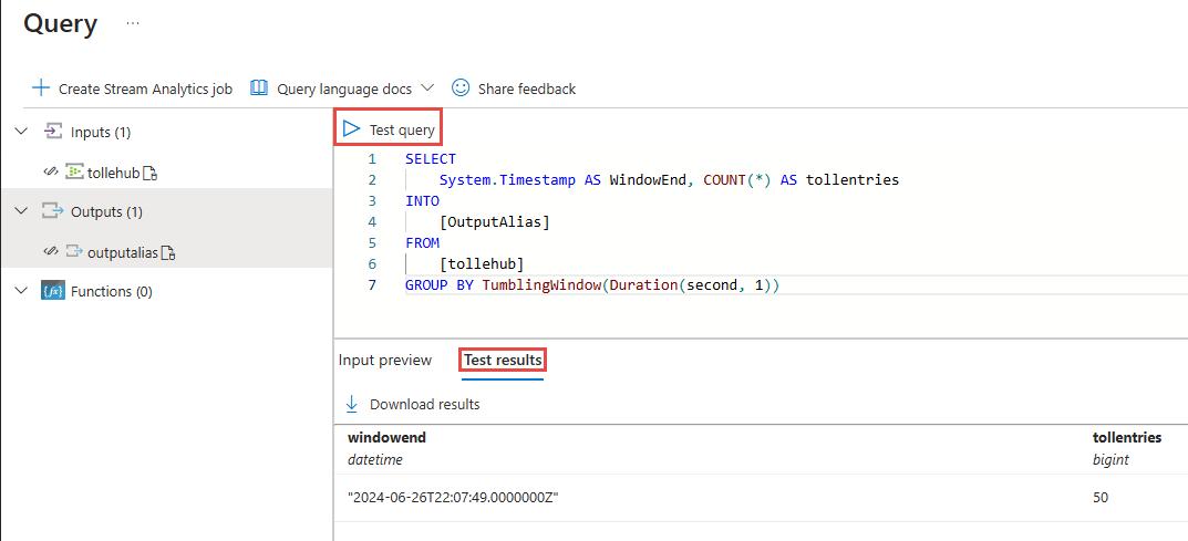 Once you tested the query and you want to move it in to production, select Create Stream Analytics job.