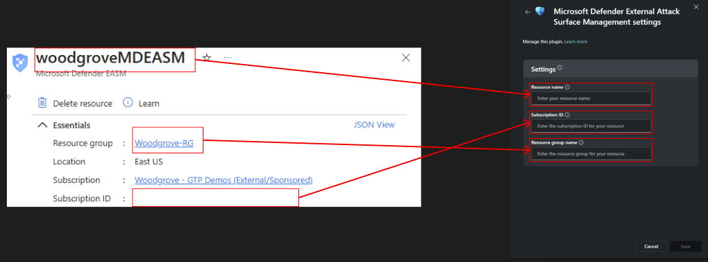 If you want Security Copilot to pull data from your Defender EASM resource, select the gear icon to open the plugin settings. Enter or select values by using the values from your resource's Essentials section on the Overview pane.