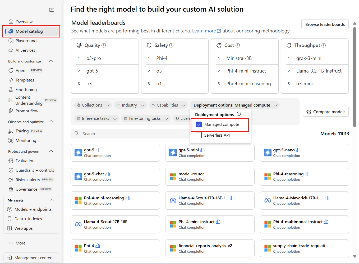 The Microsoft Foundry portal model catalog offers over 1,600 models that you can deploy using managed compute (also called managed online deployment) for real-time inference in production environments. With managed compute deployments, you get scalable, production-ready infrastructure for your large language models.