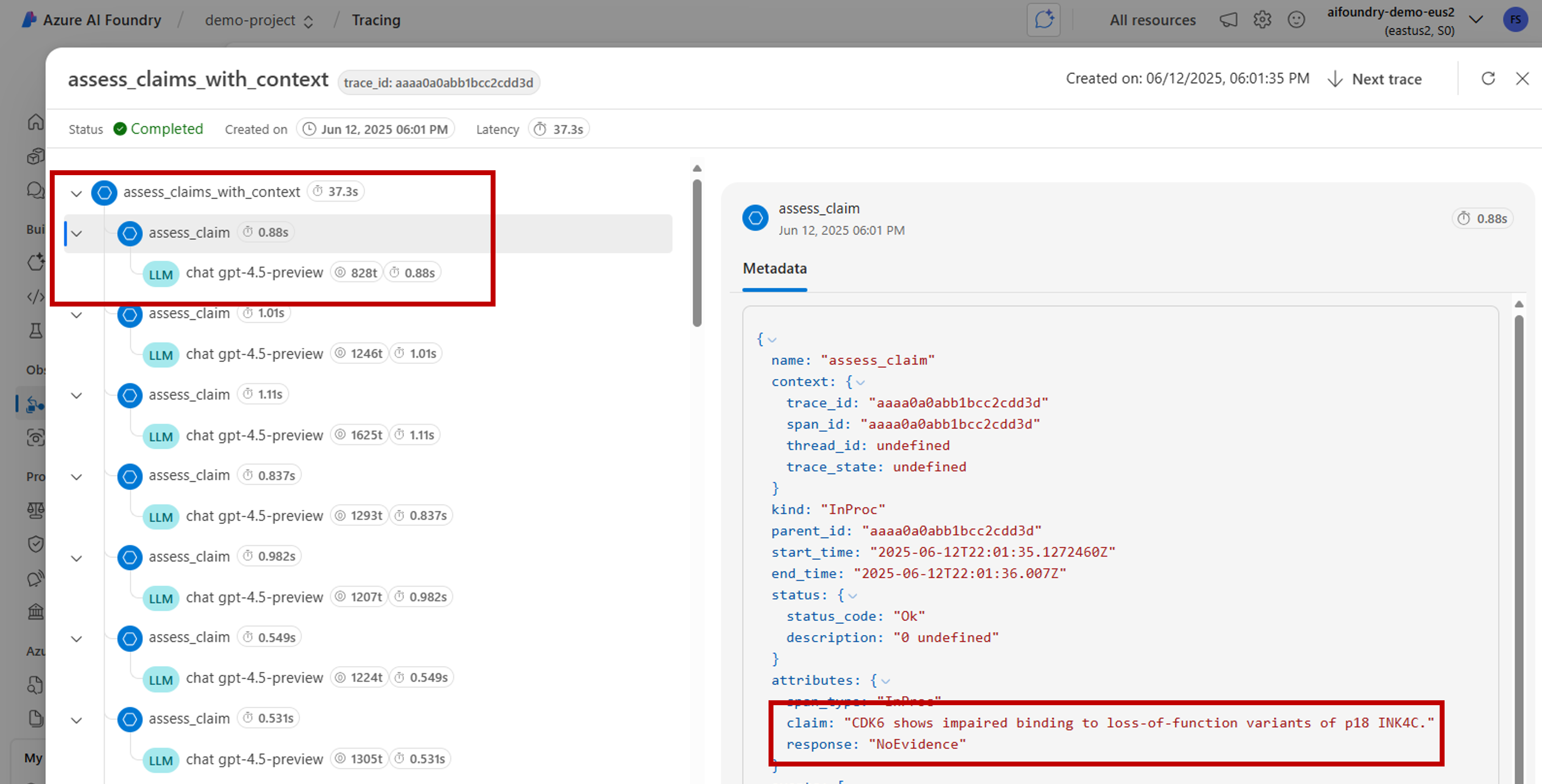 assess_claims_with_contextthat iterates over a list of claims and verifies if the claim is supported by the context using an LLM. All the calls made in this method are captured within the same span:def build_prompt_with_context(claim: str, context: str) -> str: return [{'role': 'system', 'content': "I will ask you to assess whether a particular scientific claim, based on evidence provided. Output only the text 'True' if the claim is true, 'False' if the claim is false, or 'NEE' if there's not enough evidence."}, {'role': 'user', 'content': f""" The evidence is the following: {context} Assess the following claim on the basis of the evidence. Output only the text 'True' if the claim is true, 'False' if the claim is false, or 'NEE' if there's not enough evidence. Do not output any other text. Claim: {claim} Assessment: """}] @tracer.start_as_current_span("assess_claims_with_context") def assess_claims_with_context(claims, contexts): responses = [] for claim, context in zip(claims, contexts): response = client.chat.completions.create( model="gpt-4.1", messages=build_prompt_with_context(claim=claim, context=context), ) responses.append(response.choices[0].message.content.strip('., ')) return responsesTrace results look as follows: