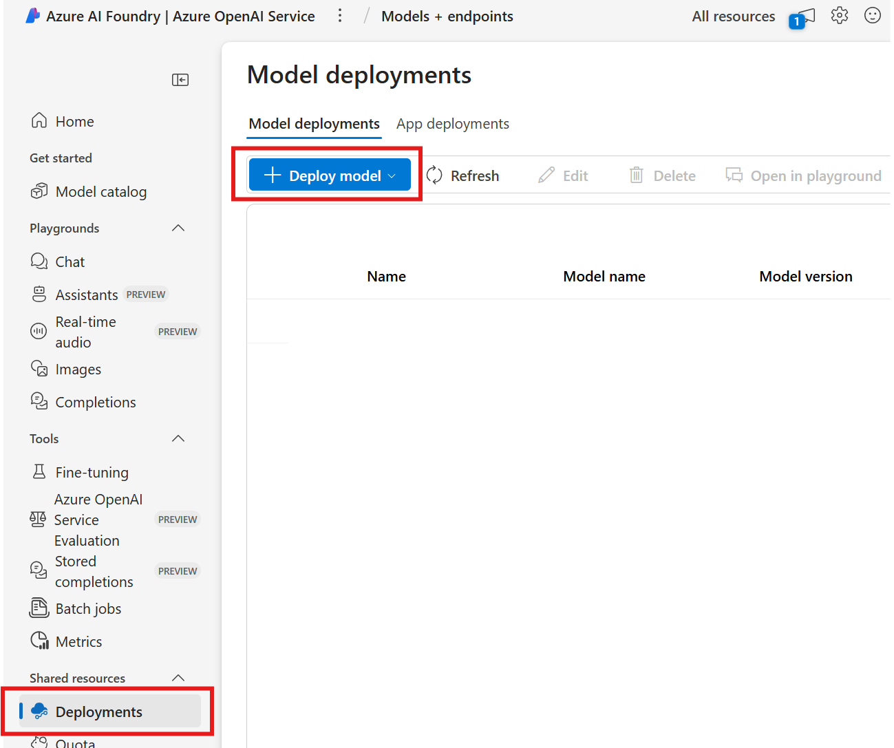 To use the capacity planner, go to the Foundry portal and select the Deployments button. Then select Deploy model.