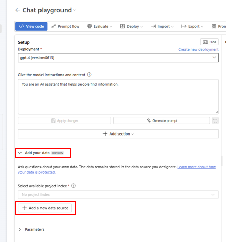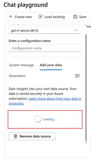 On the left side of the chat playground, select Add your data > + Add a new data source.