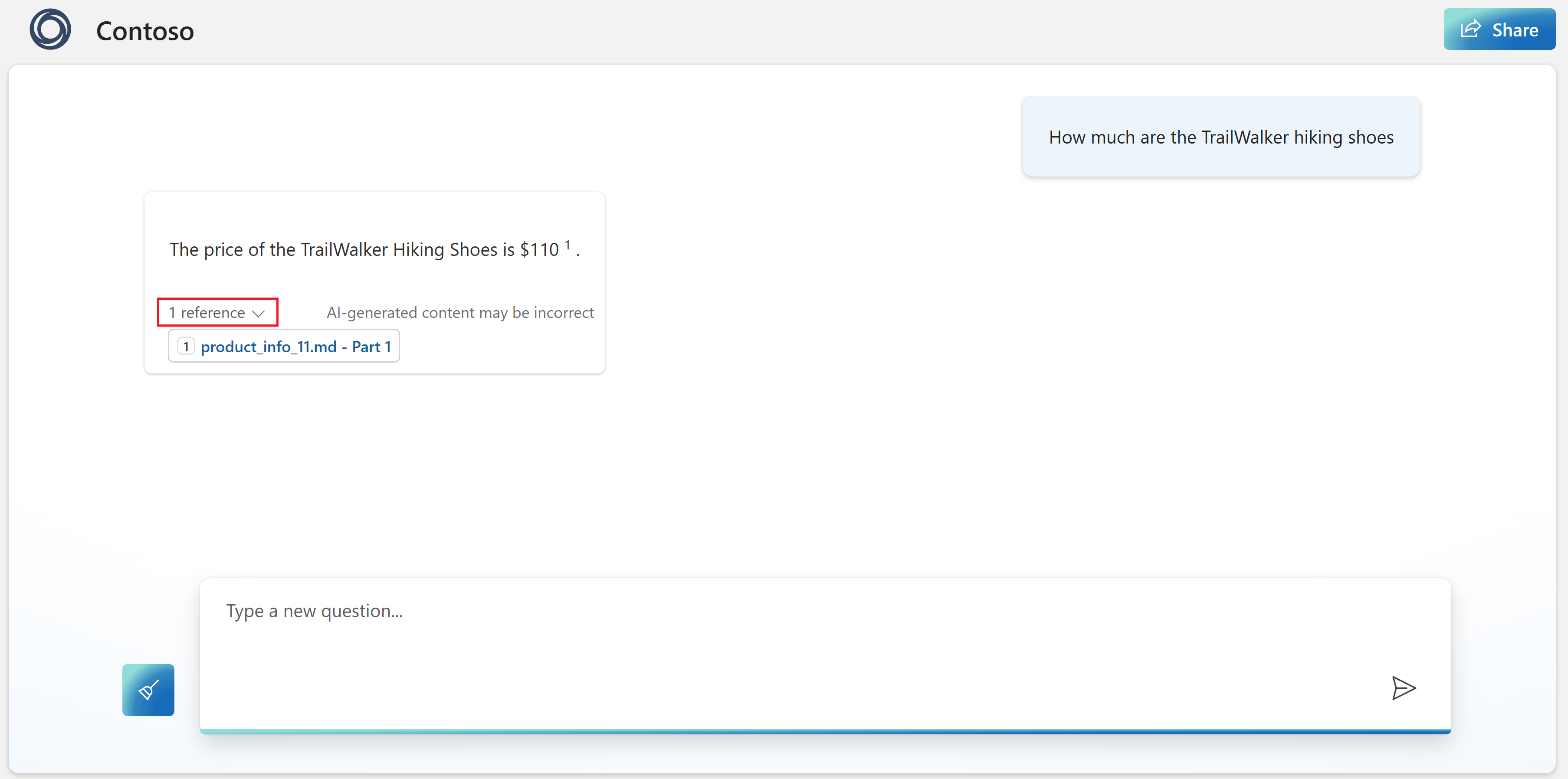 In your web app, ask the same question as before ("How much are the TrailWalker hiking shoes"). This time, the app uses information from your data to construct the response. Expand the reference button to see the data used.