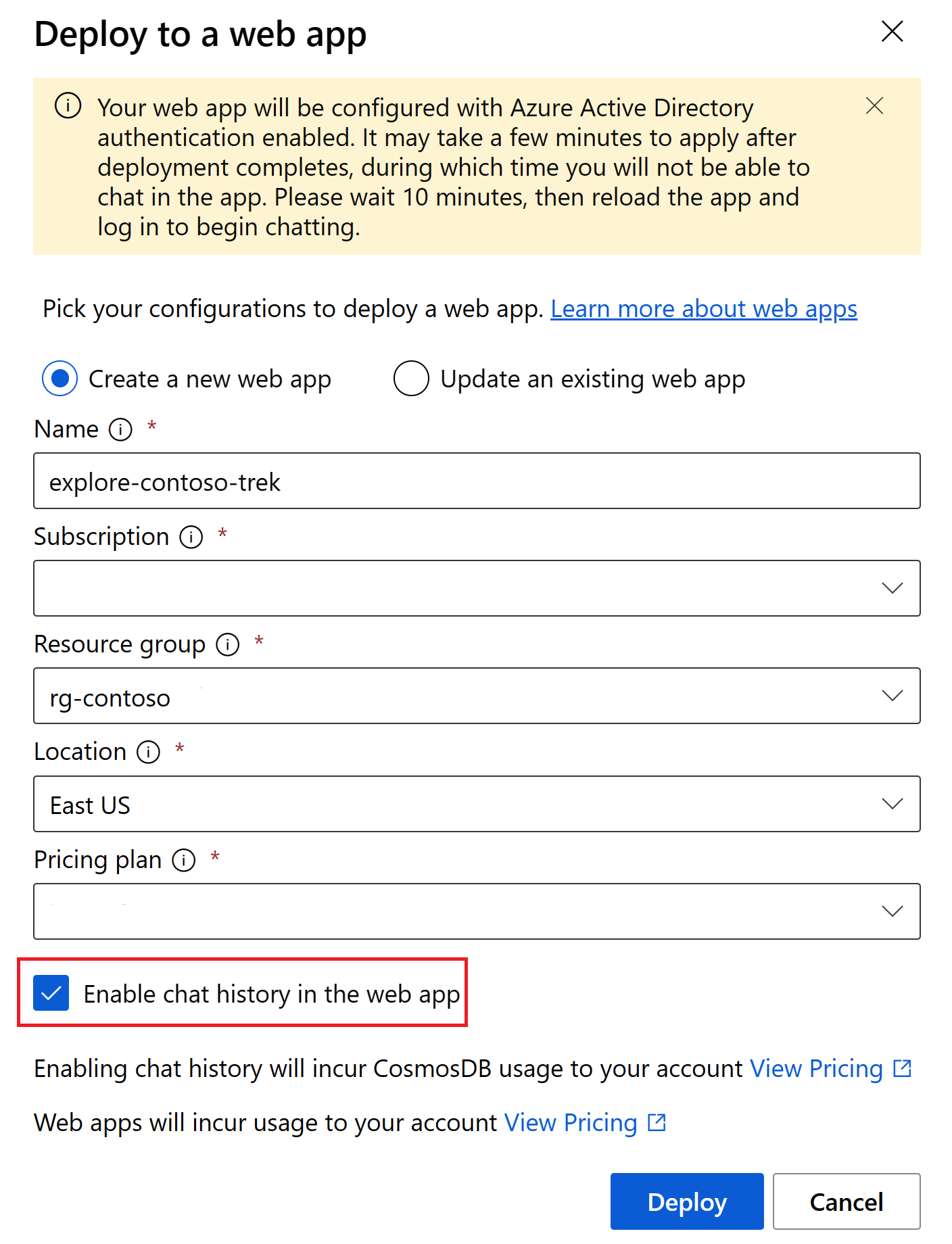 Enabling chat history creates a Cosmos DB instance in your resource group, and incurs additional charges for the storage used. Deleting your web app doesn't delete your Cosmos DB instance automatically. To delete your Cosmos DB instance and all stored chats, go to the associated resource in the Azure portal and delete it.