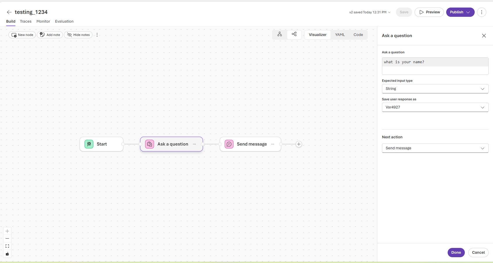 YAML visualizer view: Set the YAML Visualizer View toggle to On to store the workflow as a YAML file. Edit in either the visualizer or the YAML view. Saving creates a new version with full version history.