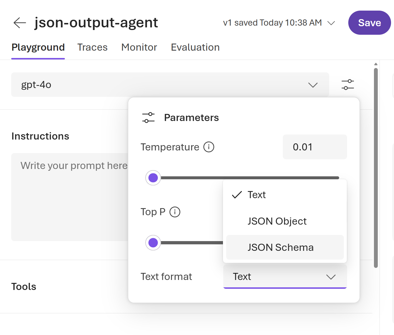Copy the desired JSON schema and paste it in the Add response format window. The following screenshot shows a math example. Select Save.