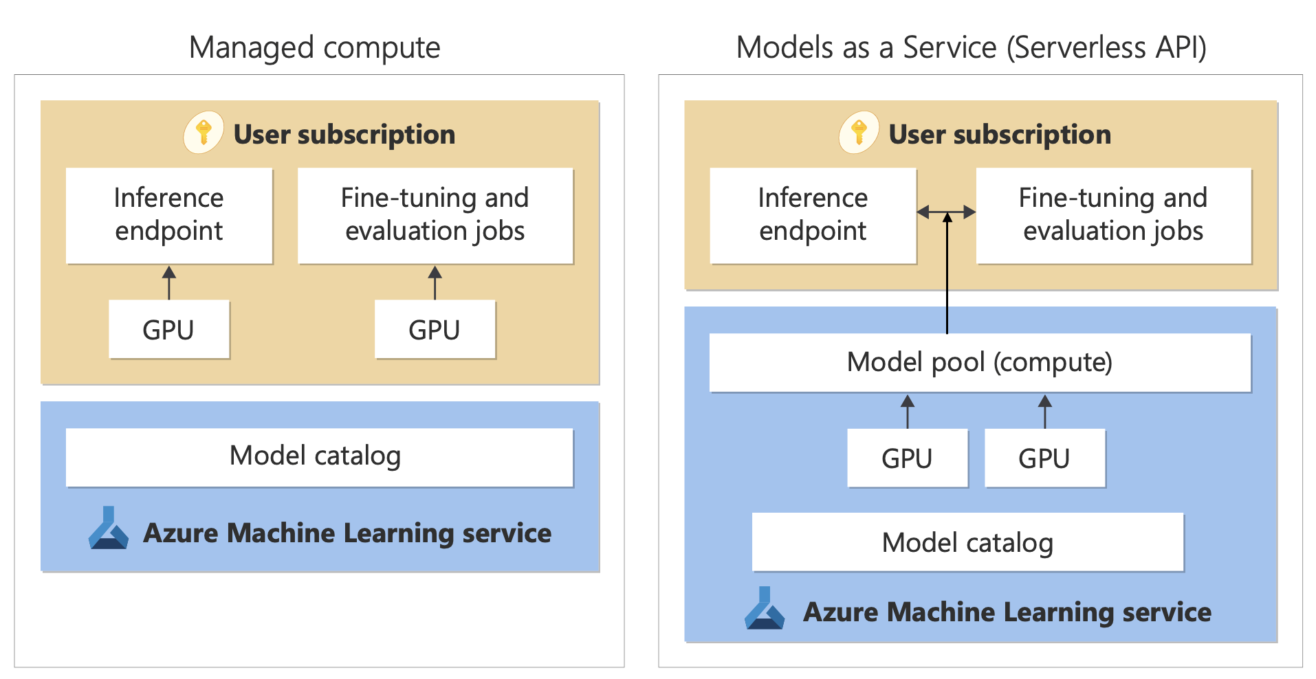 | Deployment experience and billing | Model weights are deployed to dedicated virtual machines with managed compute. A managed compute, which can have one or more deployments, makes available a REST API for inference. You're billed for the virtual machine core hours the deployments use. | Access models through a deployment that provisions an API. The API provides access to the model that Microsoft hosts and manages for inference. You're billed for inputs and outputs to the APIs, typically in tokens. Pricing information is provided before you deploy. |