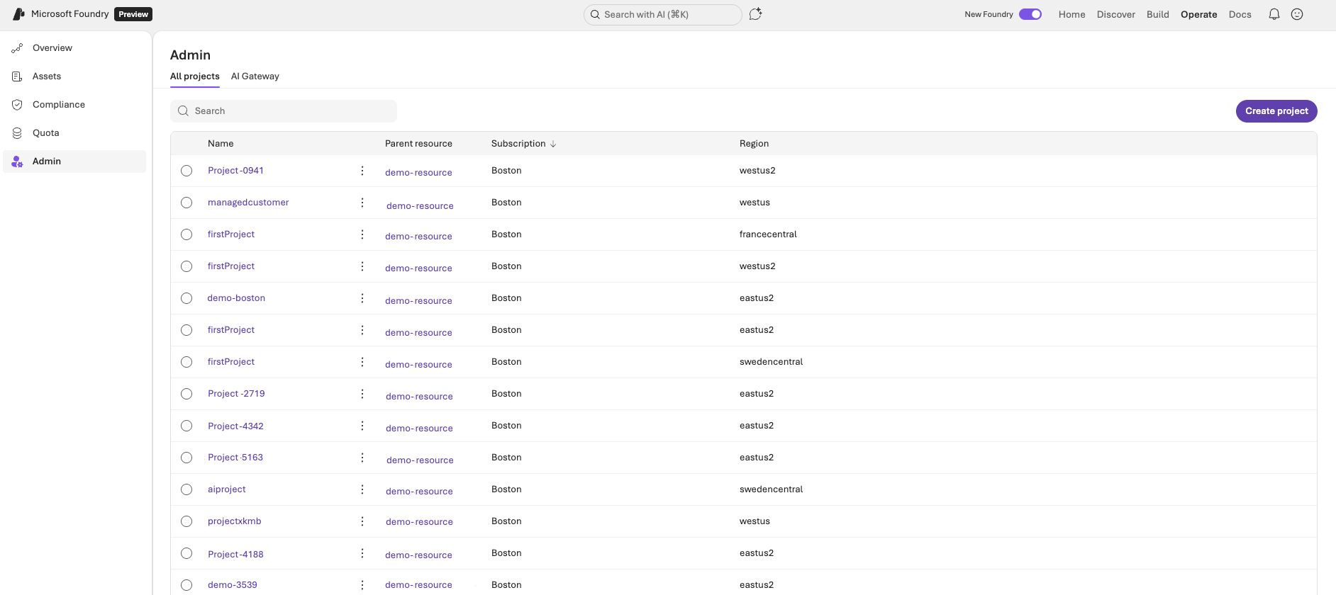 This pane extends your operational view beyond a single project. Most work in Foundry happens within a project context. The Admin pane provides an enterprise-level lens to oversee and configure multiple projects, user permissions, and linked Azure resources from one place.