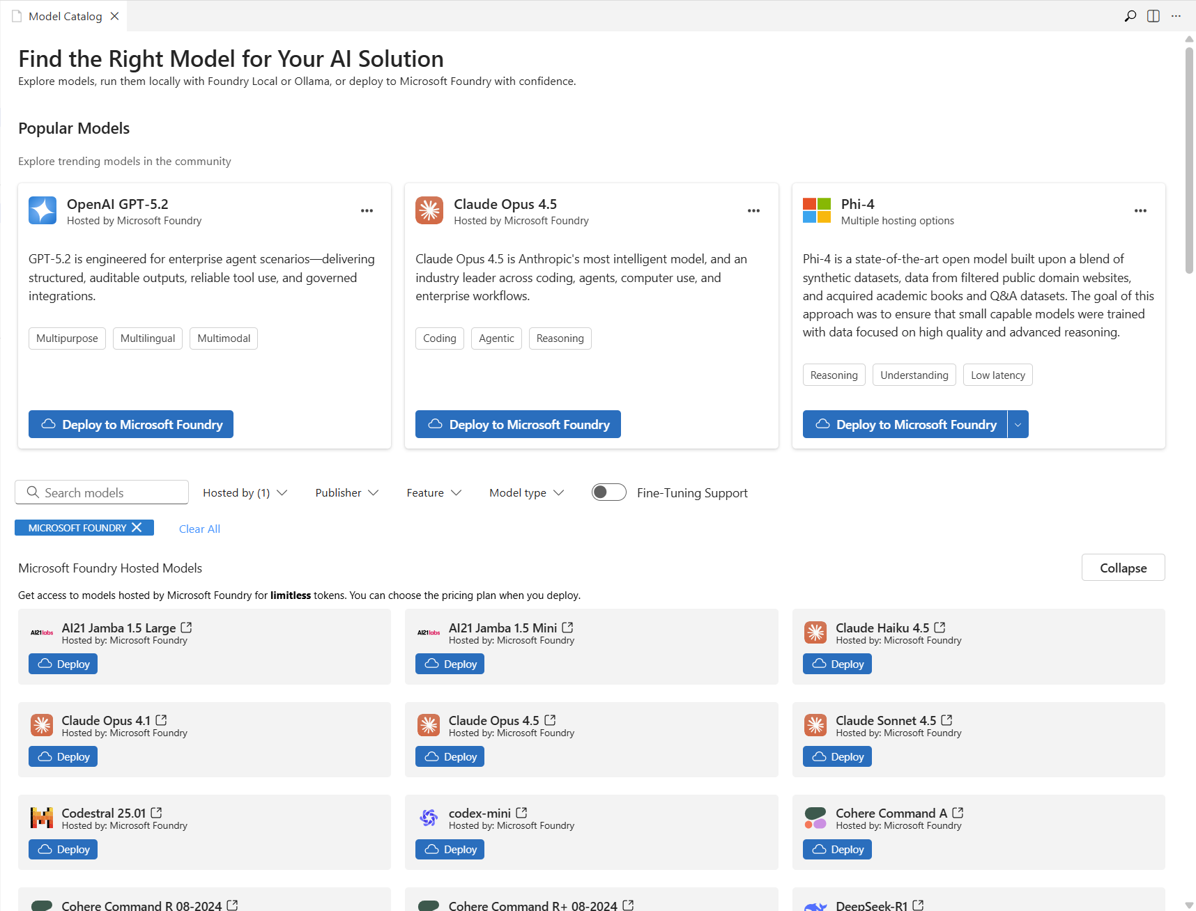 Filter the Model Catalog by Hosted by, Publisher, Feature, or Model type using the dropdowns at the top of the page. Select the Fine-Tuning Support toggle to filter models that support fine-tuning.