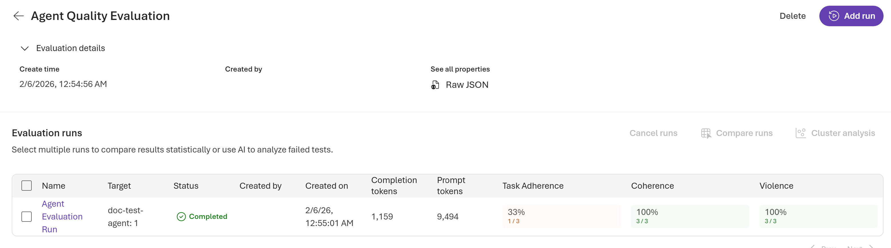 In this article, you learn how to run an agent-targeted evaluation against a Foundry agent using built-in evaluators for quality, safety, and agent behavior. Specifically, you: