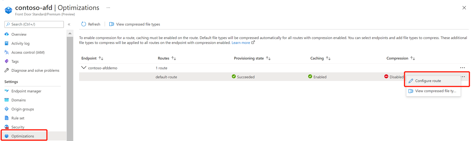 From the Azure Front Door Standard/Premium profile page, go to Optimizations under Settings. Then select the route that has compression Enabled.