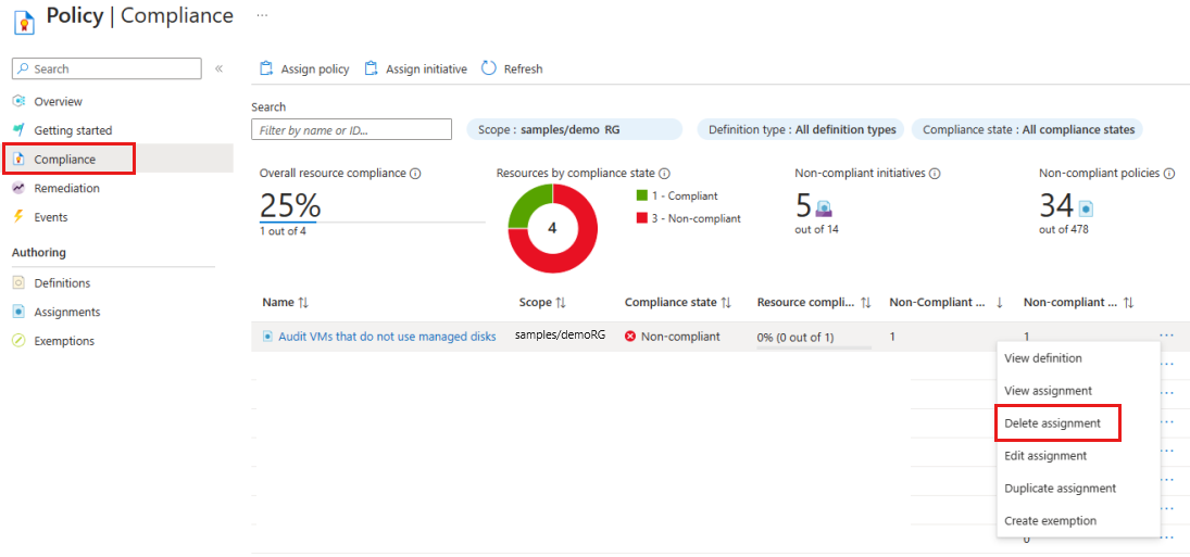 You can delete a policy assignment from Compliance or from Assignments.