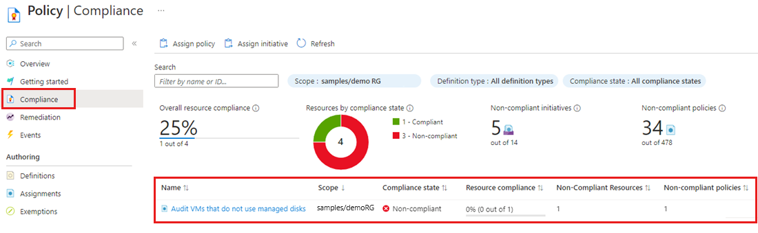 The first step in understanding compliance in Azure is to identify the status of your resources. In this quickstart, you create a policy assignment to identify non-compliant resources using Azure portal. The policy is assigned to a resource group and audits virtual machines that don't use managed disks. After you create the policy assignment, you identify non-compliant virtual machines.