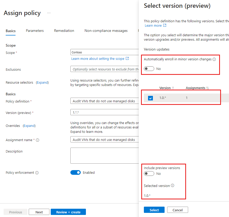 Select the ellipsis (...) to view available versions and the options to enroll in minor version updates or preview versions. You must select a version to change the options. For more information, go to definition version within assignment.Assignment name By default uses the name of the selected policy. You can change it but for this example, use the default name. Description Optional to provide details about this policy assignment. Policy enforcement Defaults to Enabled. For more information, go to enforcement mode. After a Policy definition is selected, you can change the Version (preview) options.