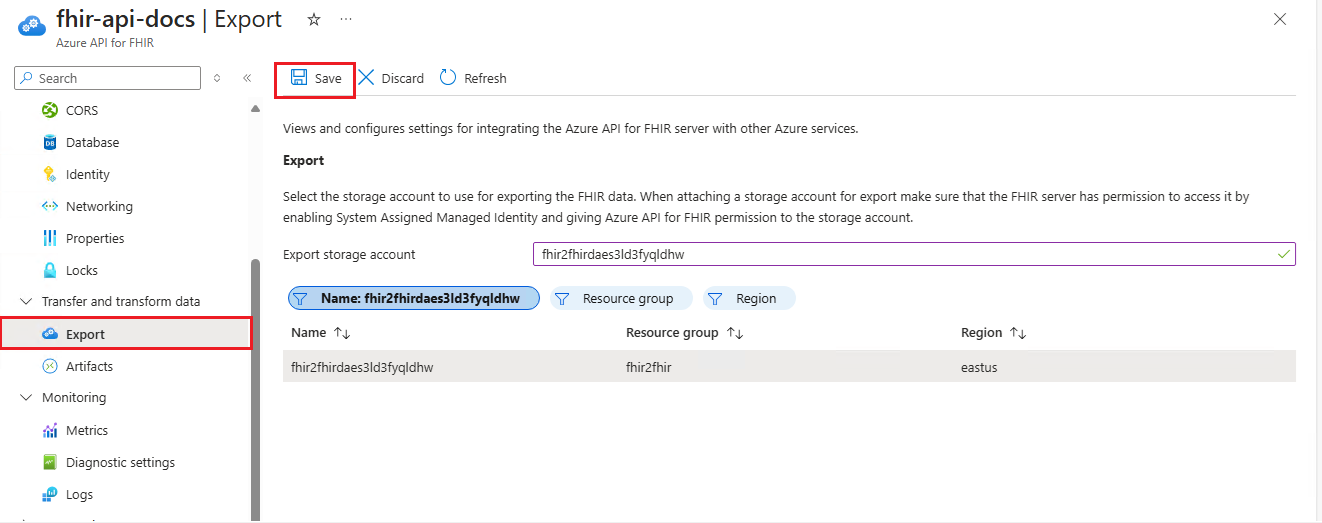 - Select the storage account in Azure API for FHIR as the export storage account.
