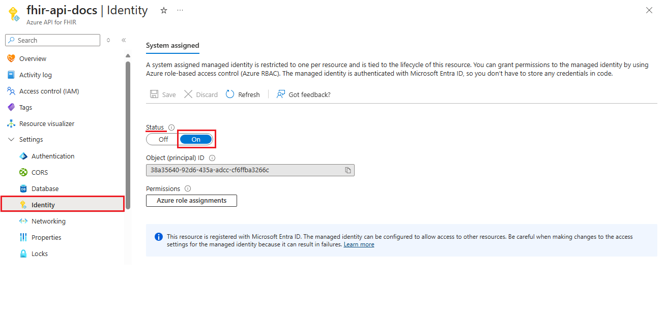 In the Azure portal, go to the Azure API for FHIR service. Select Identity. Changing the status to On enables managed identity in Azure API for FHIR.